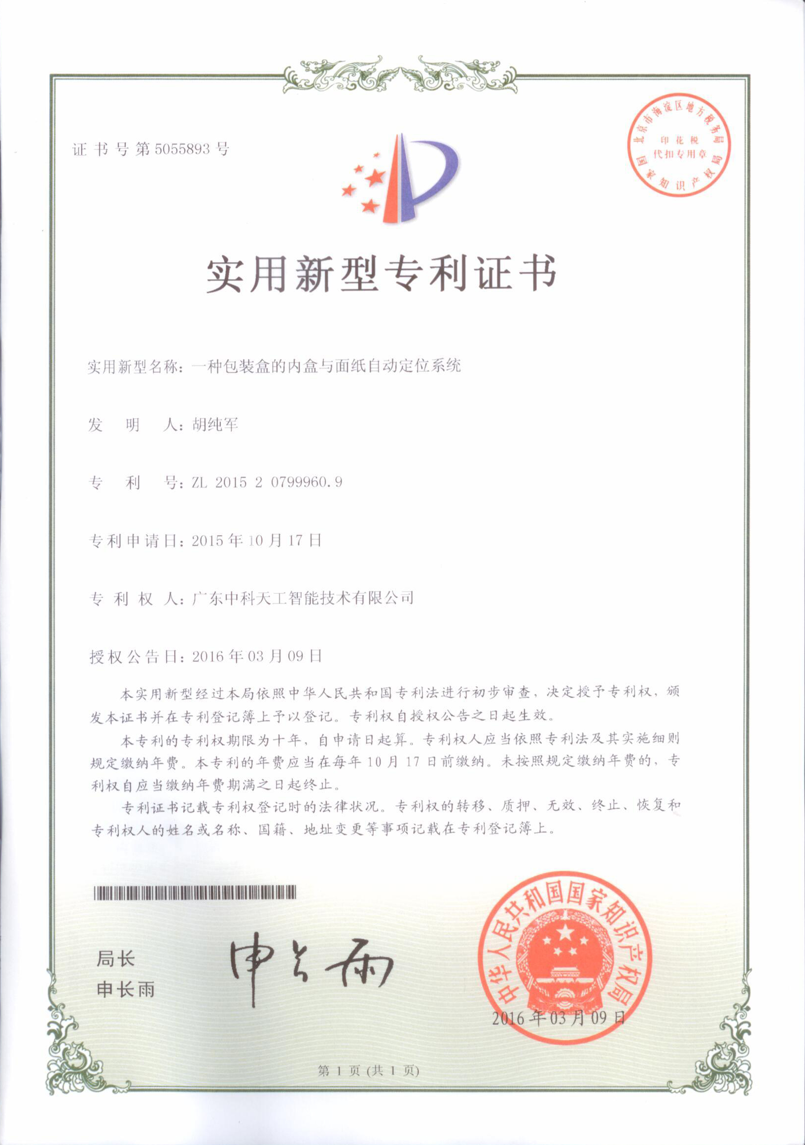 資質(zhì)榮譽(yù)-實(shí)用新型-一種包裝盒的內盒與面紙自動(dòng)定位系統